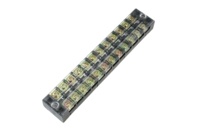 Bornera de 12 posiciones en color negro, indicada para circuitos con demanda elevada (hasta 35 A por polo). Ofrece seguridad mediante tapa y conexiones firmes.