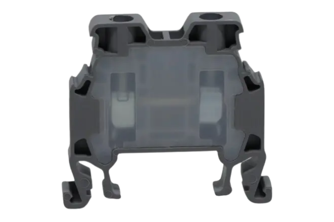 Accesorio de terminación para riel DIN compatible con borneras de 4 mm²; permite cerrar y rematar la fila de borneras, asegurando un acabado seguro y ordenado en el carril.