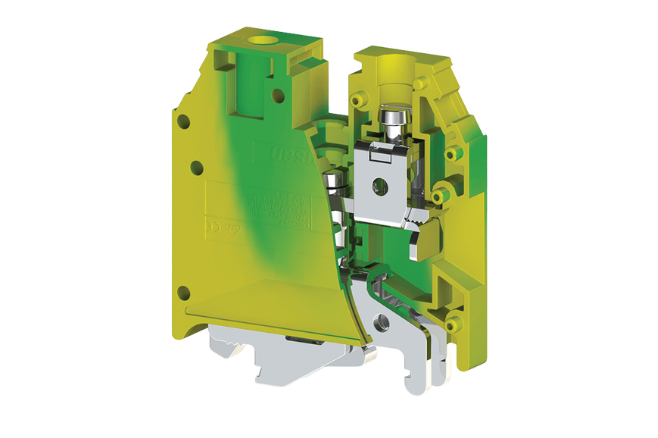 Bornera de puesta a tierra para conductor de 16 mm², pensada para sistemas de protección de mayor capacidad en instalaciones residenciales e industriales.