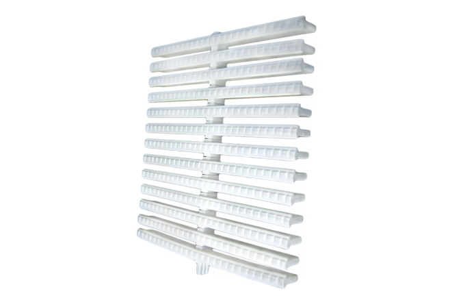 El diseño modular de la rejilla se compone de unidades individuales que se conectan a través de una columna central, lo que permite una instalación sencilla sin necesidad de cortes, además de adaptarse fácilmente a curvas y formas irregulares en el perímetro de la piscina.